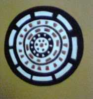 A ordenação dos círculos, o tracejado cor-de-terra que entra em harmonia com a brancura e com o tom laranja predominante se misturam a pequenos quadrados dentro de círculos menores, até alcançar o centro do desenho que sugere uma possível lugar ancestral.