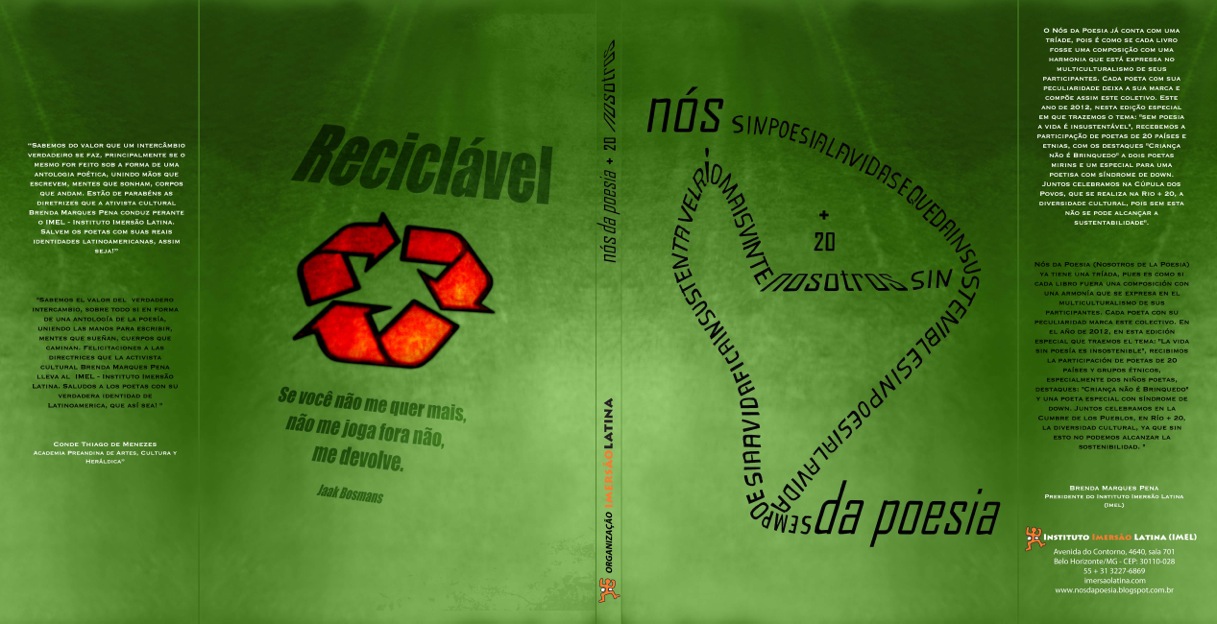Com este tema, o IMEL – Instituto Imersão Latina, juntamente com a APPERJ – Associação Profissional de Poetas no Estado do Rio de Janeiro, Soy Loco Por Ti, do Paraná, Comitê Mineiro da Cúpula dos Povos e Ciranda, celebram a diversidade cultural na Cúpula dos Povos, no Rio de Janeiro. O lançamento do livro Nós da Poesia + 20 Nosotros, organizado pelo Imel será no dia 18 , próxima segunda-feira, às 14 horas, no aterro do Flamengo, tenda 28 (Patrick Lumumba), no Rio de Janeiro. E na quarta, 20 de junho, dia de abertura da Conferência da ONU Rio + 20, poetas participantes do projeto Nós da Poesia fazem um sarau às 19 horas, no Quiosque Estrela de Luz, na praia do Leme.