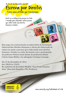 “A gente pede para as pessoas escreverem cartas para as autoridades competentes, para que elas tomem uma atitude sobre a situação do defensor em risco ou sobre o caso de violação de direitos humanos que está ocorrendo”, disse à Agência Brasil a assessora de Direitos Humanos da ONG, Renata Neder. A maratona de cartas se estenderá até o dia 16 deste mês.