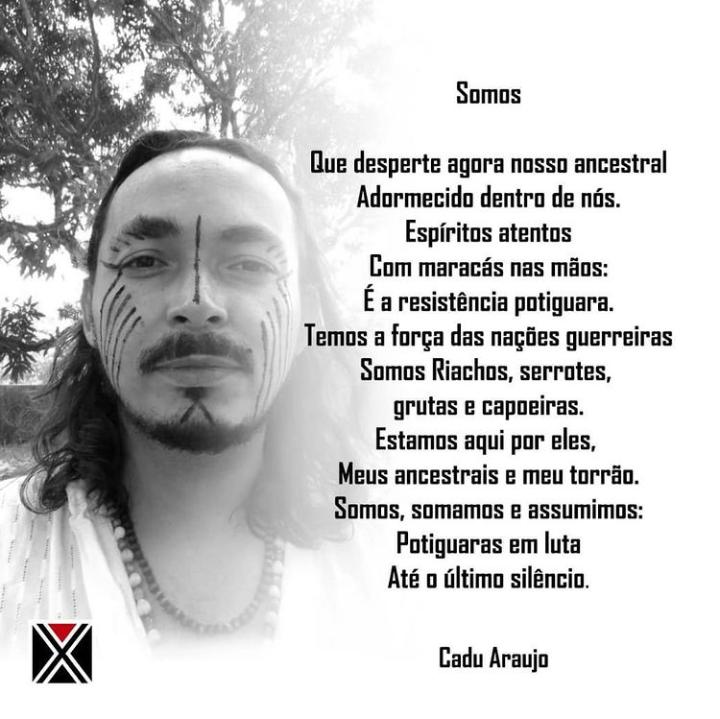 CADU ARAUJO (Carlos Eduardo Araujo); potiguara, artista, educador, pesquisador das culturas indígenas e das artes xamânicas. Desenvolve estudos referentes a “Saberes da Tradição e Xamanismo”, na Universidade Federal do Rio Grande do Norte (UFRN). Realiza projetos artisticos e culturais no Goto Seco: Movimento Alternativo. Cadu Araújo também é membro do Coletivo Indígenas do Vale de Ceará-Mirim/RN.
