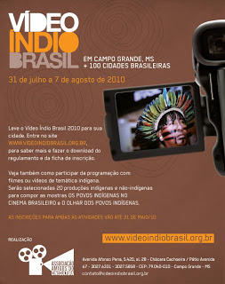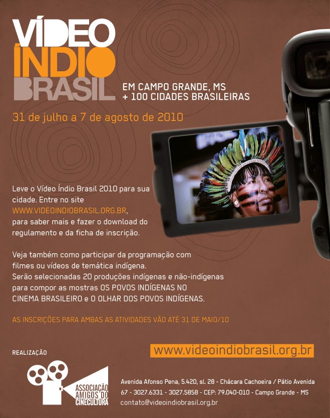 No período de 10 de abril a 31 de maio de 2010 estarão abertas as inscrições para produções audiovisuais e cidades brasileiras que tenham interesse em participar da terceira edição do Vídeo Índio Brasil que acontecerá entre os dias 31 de julho a 07 de agosto de 2010, na cidade sede, Campo Grande – MS, e mais cem municípios.