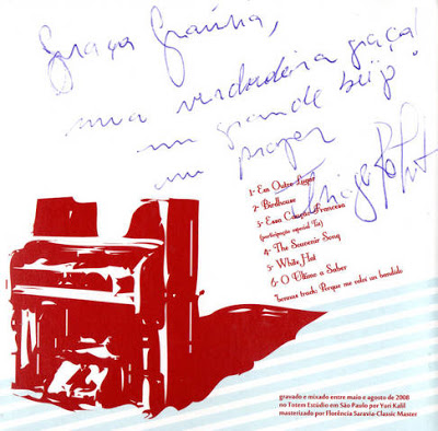 Sendo assim, tomo a liberdade de transcrever algumas letras que eu amo bastante e de quebra também apresento a imagem do presente que ganhei da minha filha: um CD gravado em São Paulo, entre o outono e o inverno de 2008; um CD autografado e com a riqueza das ilustrações de um piano, um violão, uma mala esperando a próxima viagem e a lembrança triste de um passarinho na gaiola. Boa sorte Thiago Pethit. Que Ñanderu acolha a sua poética caminhada em qualquer lugar do mundo.
